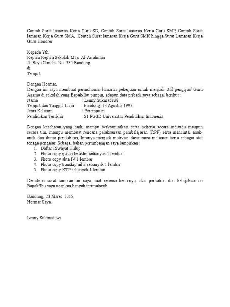 Bersama ini saya membuat permohonan lamaran pekerjaan untuk menjadi guru di sekolah yang bapak/ibu pimpin, sebagai bahan pertimbangan berikut . Setelah mengetahui beberapa hal penting sebelum melamar kerja di atas, sekarang kita. Guru adalah orang yang kerjanya mengajar di sekolah,. Oleh karena itu, melalui surat ini saya ingin melamar pekerjaan di sekolah bapak untuk mengisi posisi guru bahasa inggris. Demikian surat permohonan lamaran pekerjaan ini saya buat, besar harapan saya untuk dapat bekerja sama dan bergabung di sekolah m k.